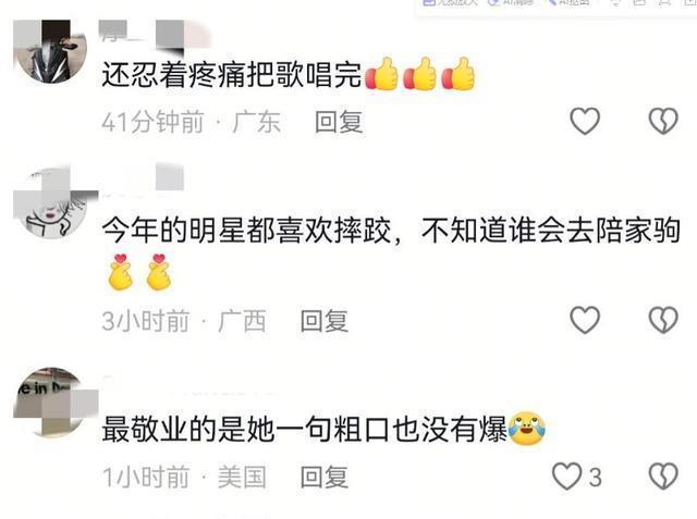 演唱会结束后,她在微博报平安:“放心!我没事!顺利进入新的一岁”。 评论区里工作人员却悄悄透露,她的腿部和胳膊其实伤势不轻,原本不建议返场表演。 可这份敬业没能换来所有人的理解。 有人翻出模糊视频断章取义:“她好像看了一眼才跳下去,分明是作秀。” “现在开演唱会都流行摔一跤博眼球了?”